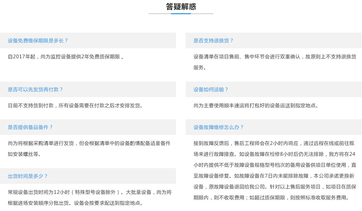 設(shè)備清單在項(xiàng)目售前、售中環(huán)節(jié)會(huì)進(jìn)行雙重確認(rèn),故原則上不支持退換貨服務(wù)。